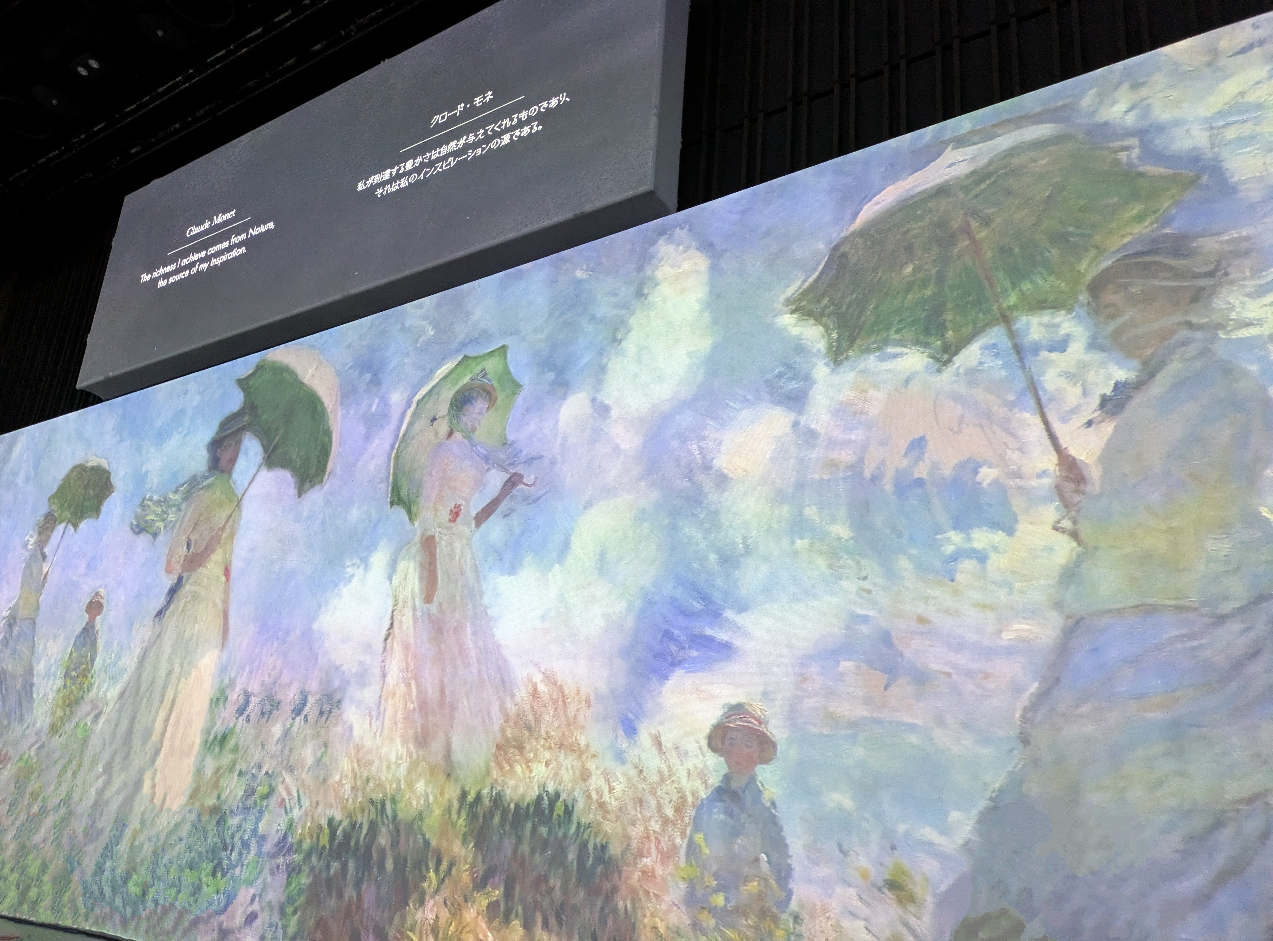 モネ&フレンズ・アライブ 行ってきました!https://monetalivejp.com/index.html没入型展覧会初体験でした〜!土曜日に行ったので人もまあまあ多かったのですが、運よく前の方に座ることができて、没入感を感じることができました。わたしからの視界はこんな感じ。大きなスクリーンに覆われていて、座っている床までプロジェクションマッピングが映し出されていてすごかった…。もちろん音楽も。美術はあまり深く知らなかったので、「印象派ってそういうことなんだ」という初歩的なところから知りました。でも、そういう美術鑑賞は慣れてない人も世界に入り込むことができるので、良い空間だった……。今度は上野のモネ展に行ってみたい。https://www.ntv.co.jp/monet2024/#favorite #daily favorite 2024.7.28(Sun) 22:37:46 memo