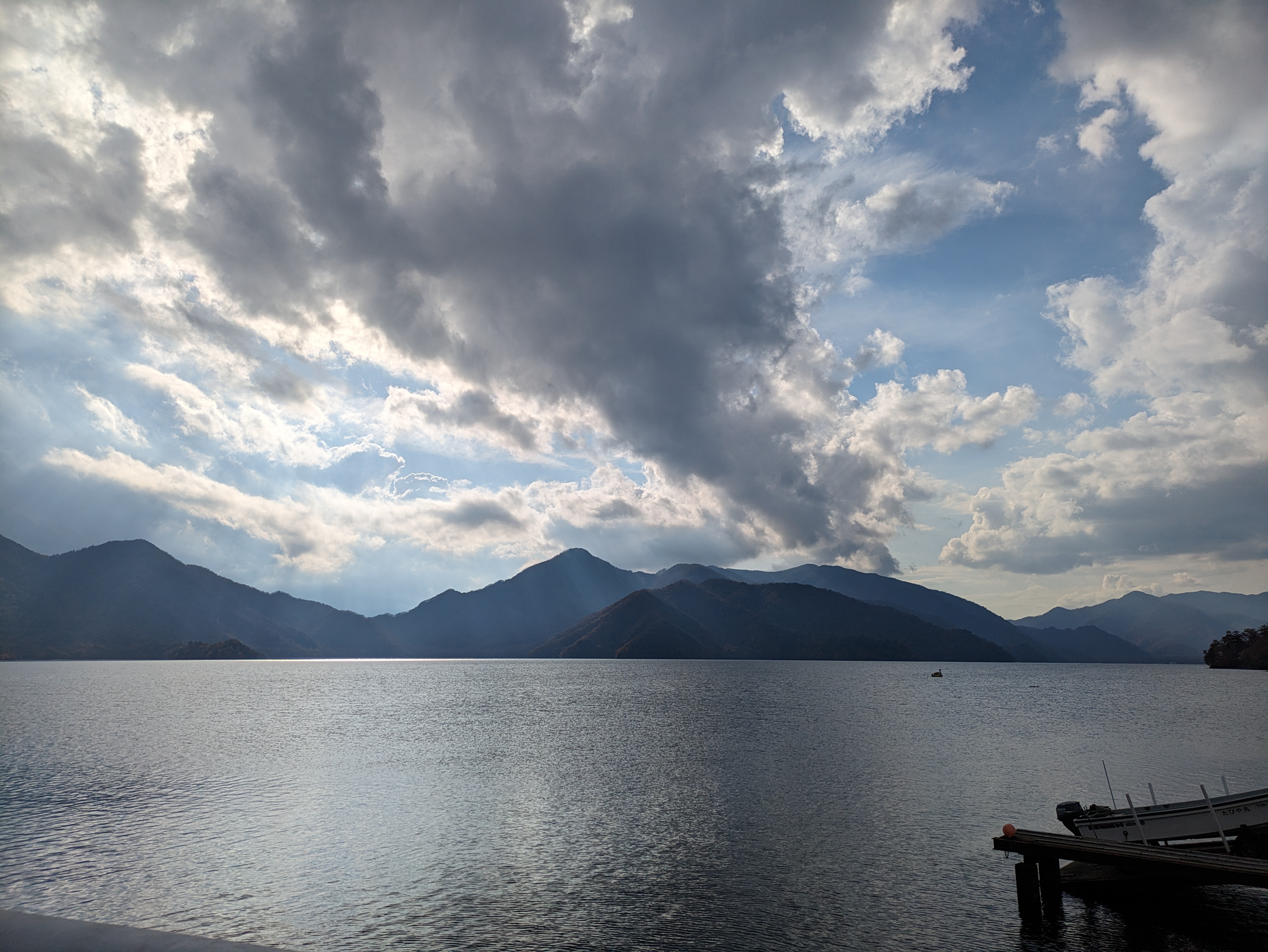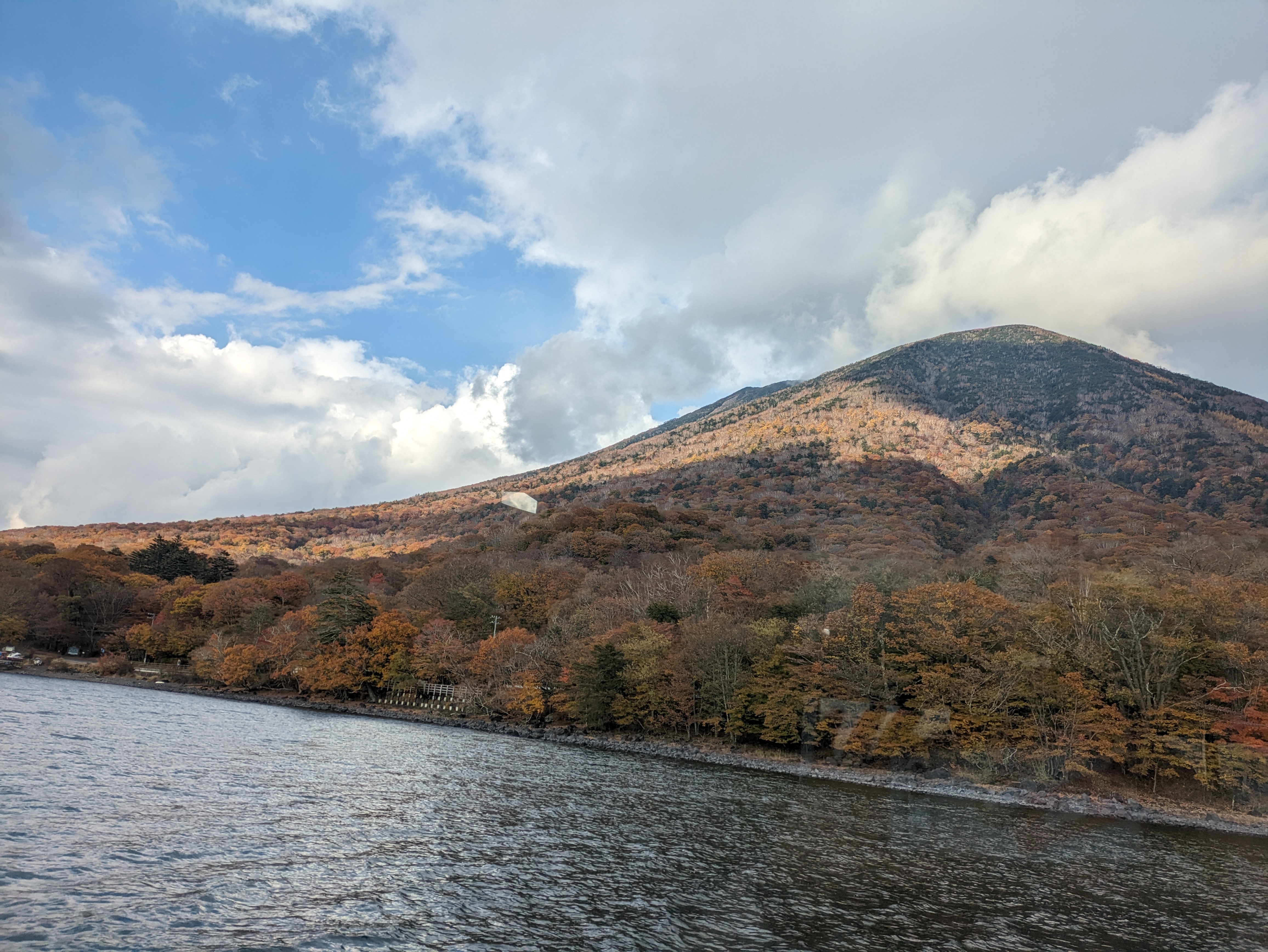 湖畔からの景色と男体山。午前中雨だったのかな?空がダイナミックできれいでした……!